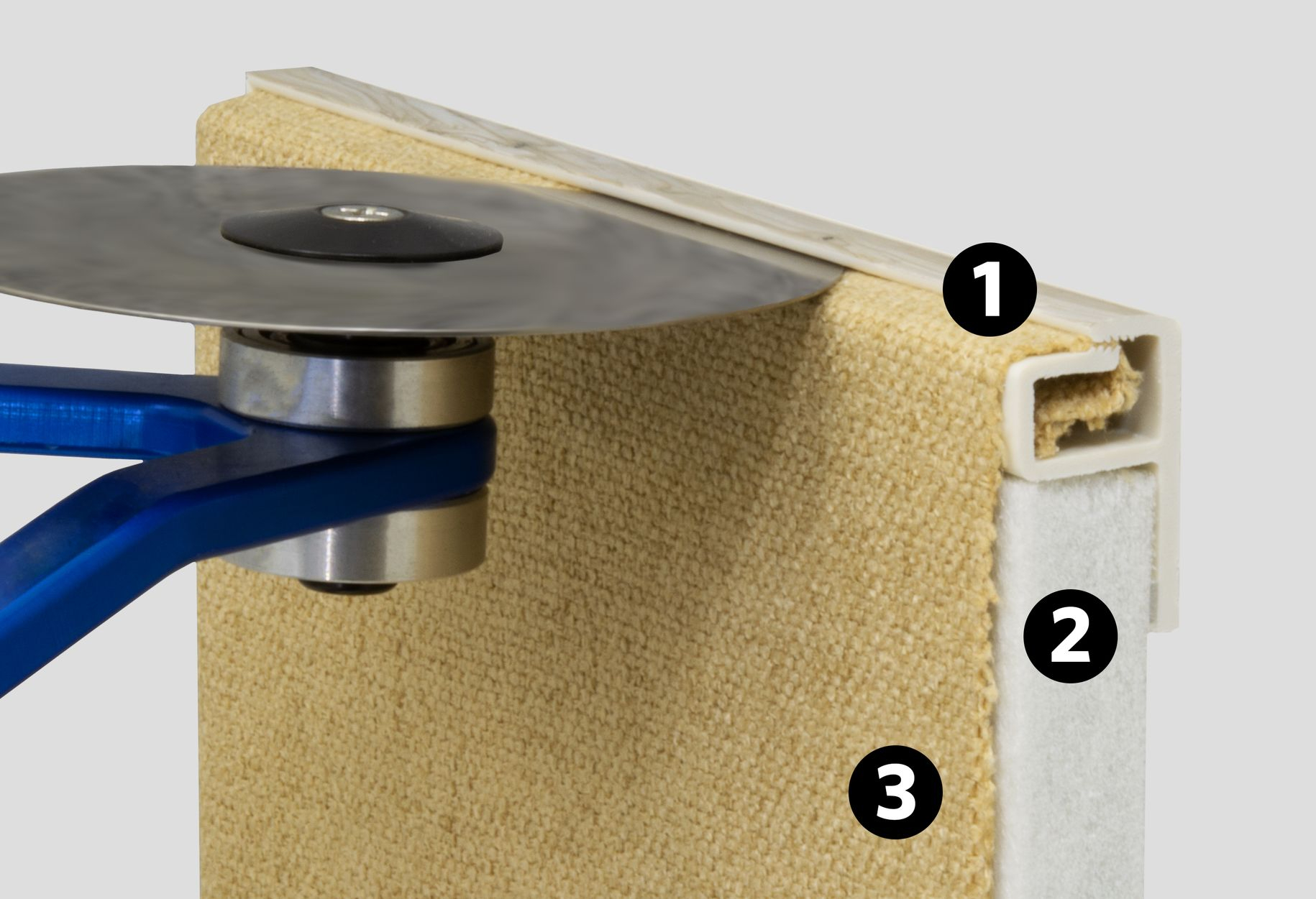 Acoustic infill is placed inside the track system, and fabric is stretched across the surface and mechanically tensioned into the track.