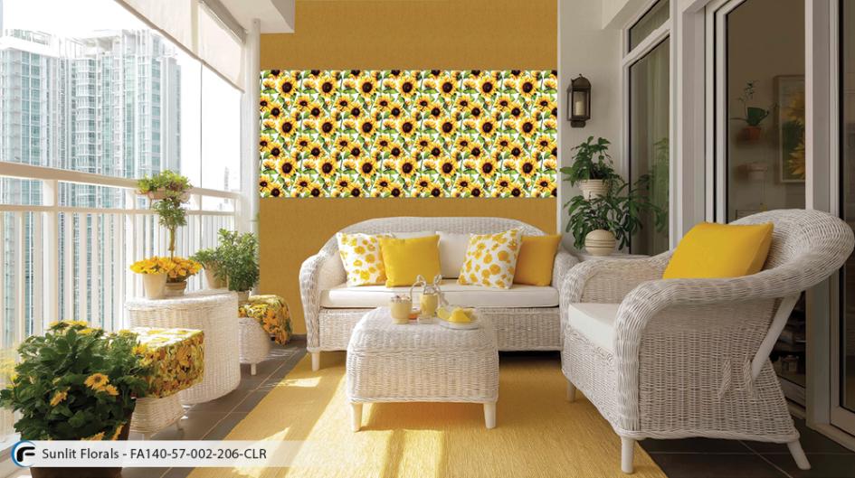 Sunflowers in a subtle orientations create a playful rhythm across a crisp white backdrop, allowing each bloom to stand out without overwhelming the space. A thoughtful balance of pattern and fabric, it brings brightness to interiors that welcome an easy elegance.
