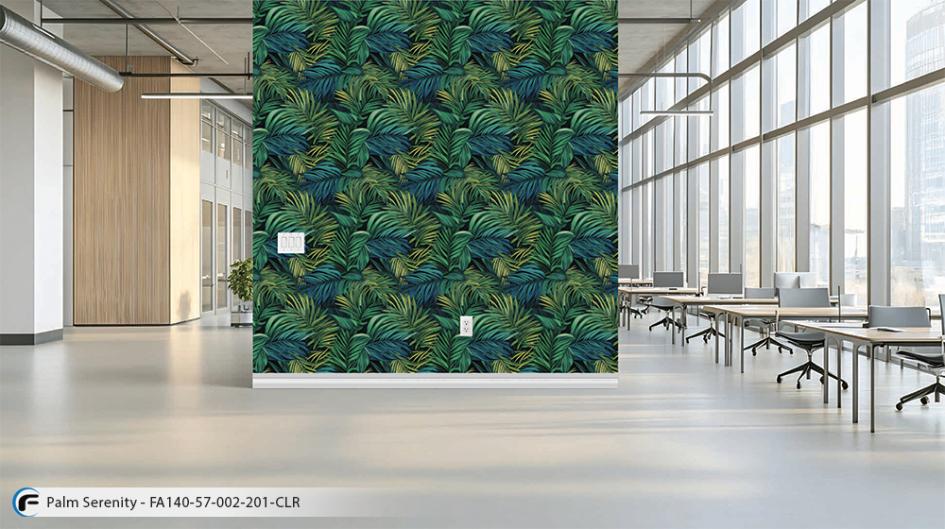 Palm Serenity brings the calming richness of nature indoors with a layered canopy of palm leaves in varying shades of green. As a fabric for walls, it adds depth and texture to interiors while supporting spaces that value both beauty and performance.